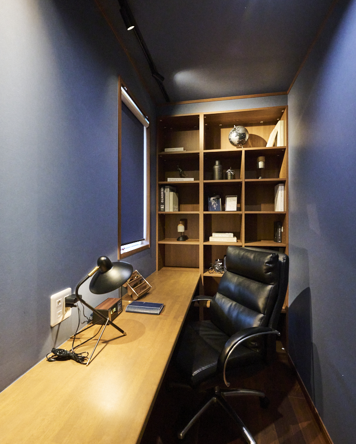 ネイビーの壁に囲まれて、まるで大人の隠れ家みたい。椅子に座ってみたら、この"おこもり感"にやられました。