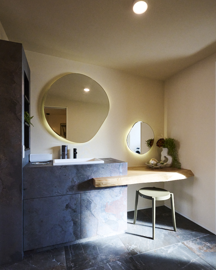 しずくみたいな形の鏡が2つ。後ろから光が漏れる間接照明も素敵で、まるでホテルみたいな洗面室。木の一枚板のカウンターには、ちょっとしたメイクスペースもあるから、朝の支度がゆっくり楽しめそう。