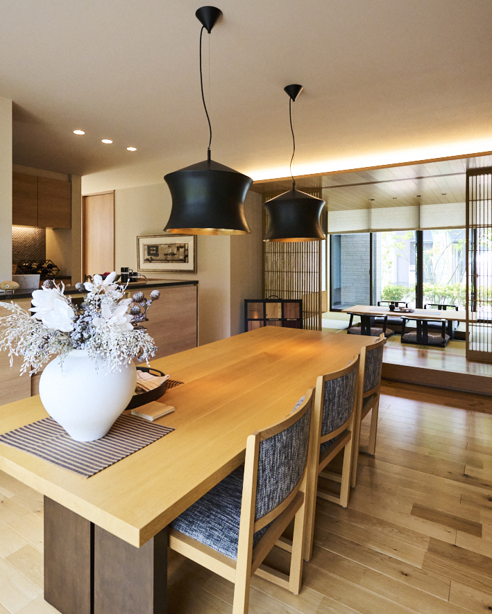 ダイニングの横に、すっと一段上がるリビング和室。こちら側から眺めると、障子越しの緑とやわらかな光が重なって、空間全体がまるで一枚の絵のようでした。