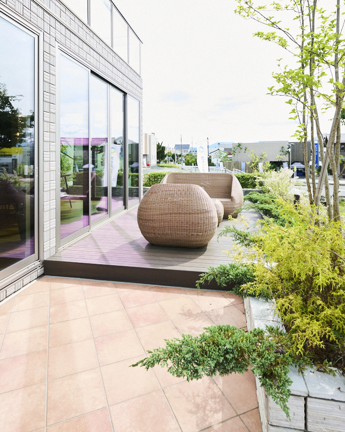 さらに、リビングの外にはタイル&ウッドデッキも。大きな窓とつながるデッキは、外もリビングの延長のような感覚。