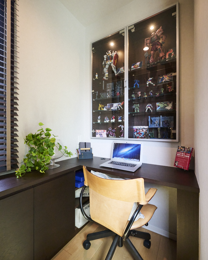 寝室の一角には、趣味を楽しめそうなこんなスペースも。デスクの前にディスプレイ棚があり、好きなものを飾れるつくりになっていました。