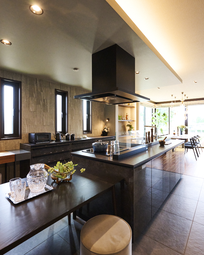 キッチンはI型のアイランドキッチン。落ち着いたダークカラーで空間にもよくなじんでいました。