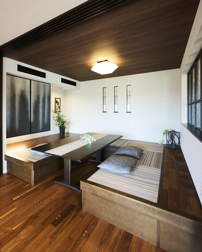 LDKの一角には、小上がりの畳スペースも。リビングの延長のように使えるうえ、引き戸を閉めれば来客用の客間としても使えるマルチな空間でした。